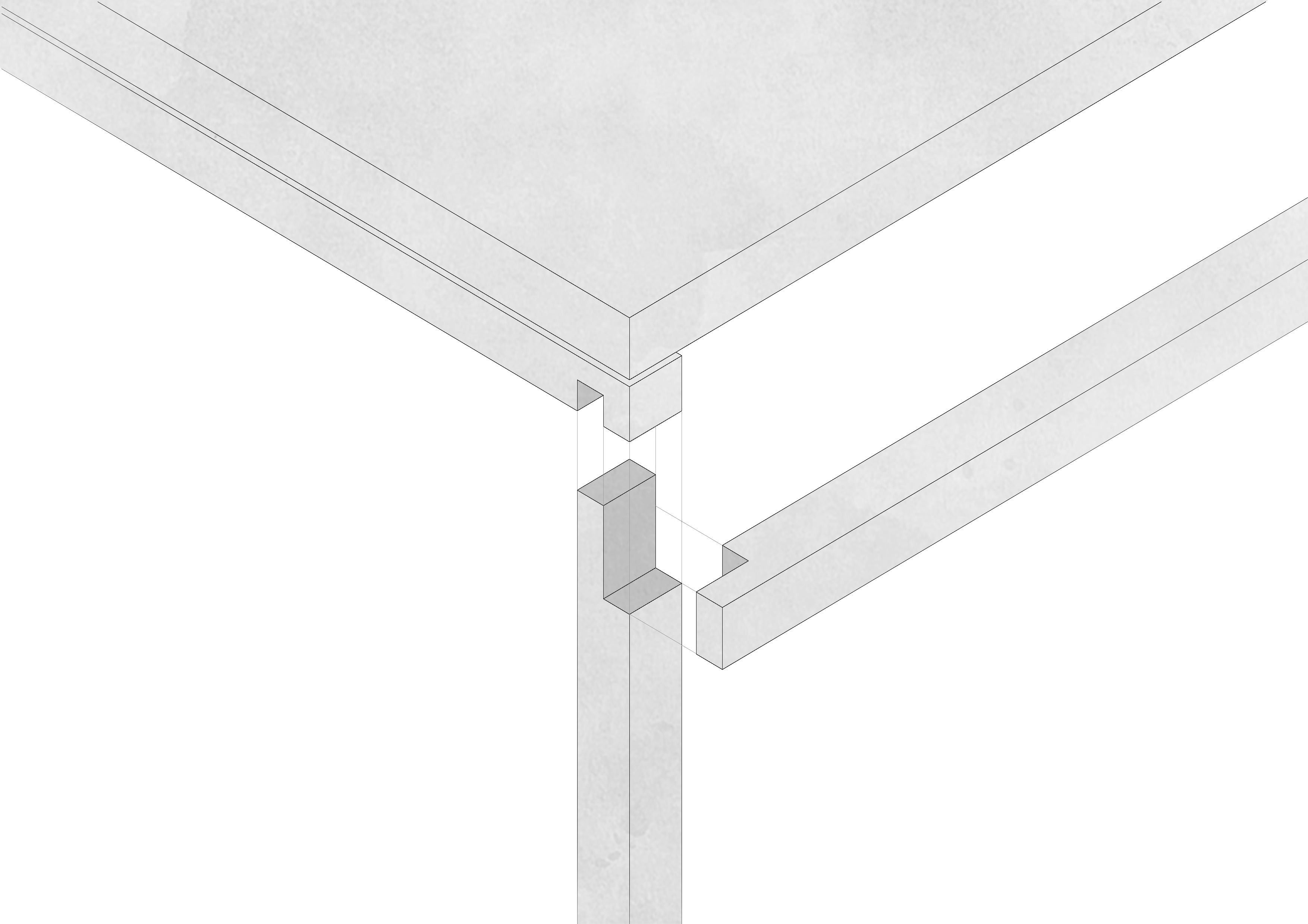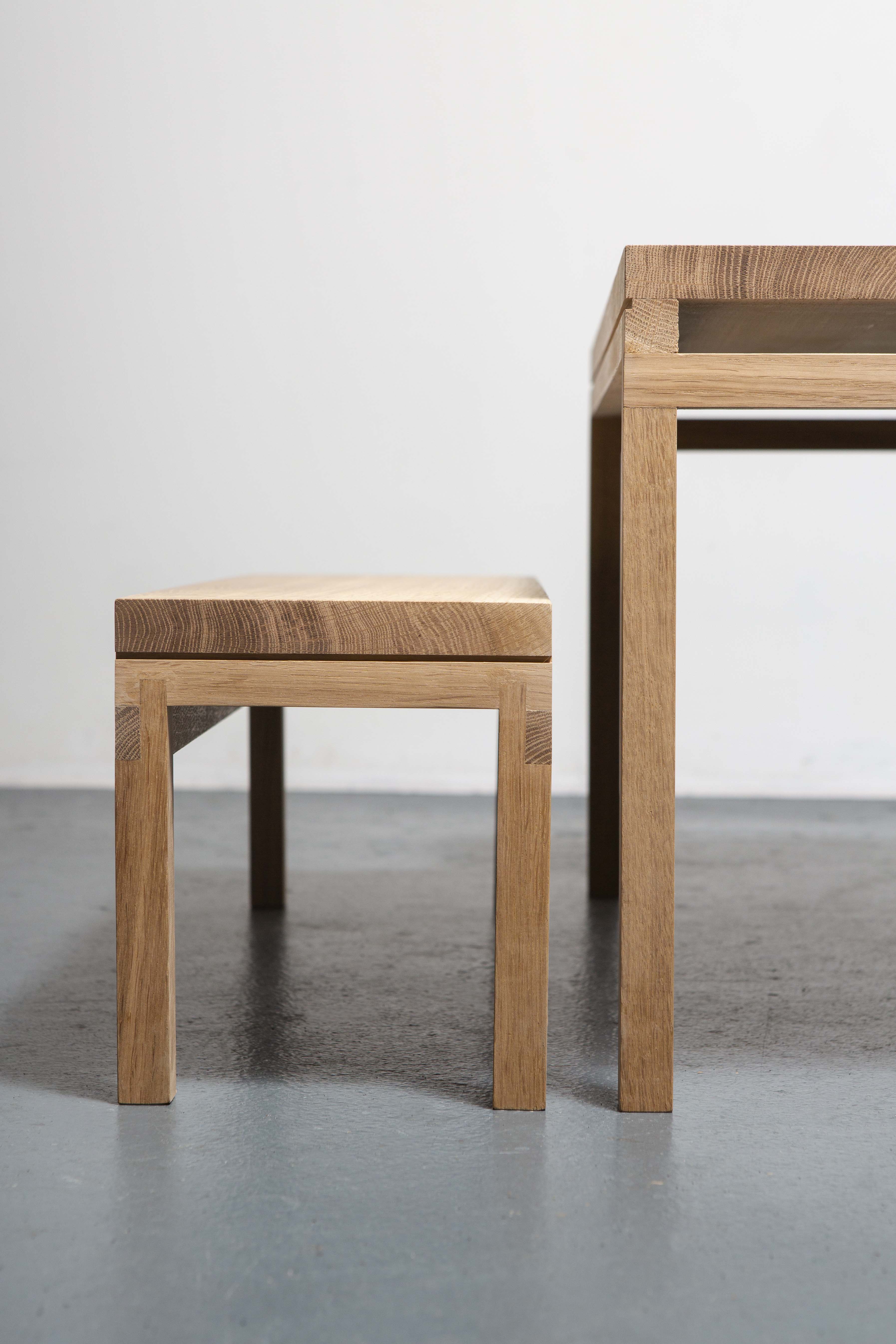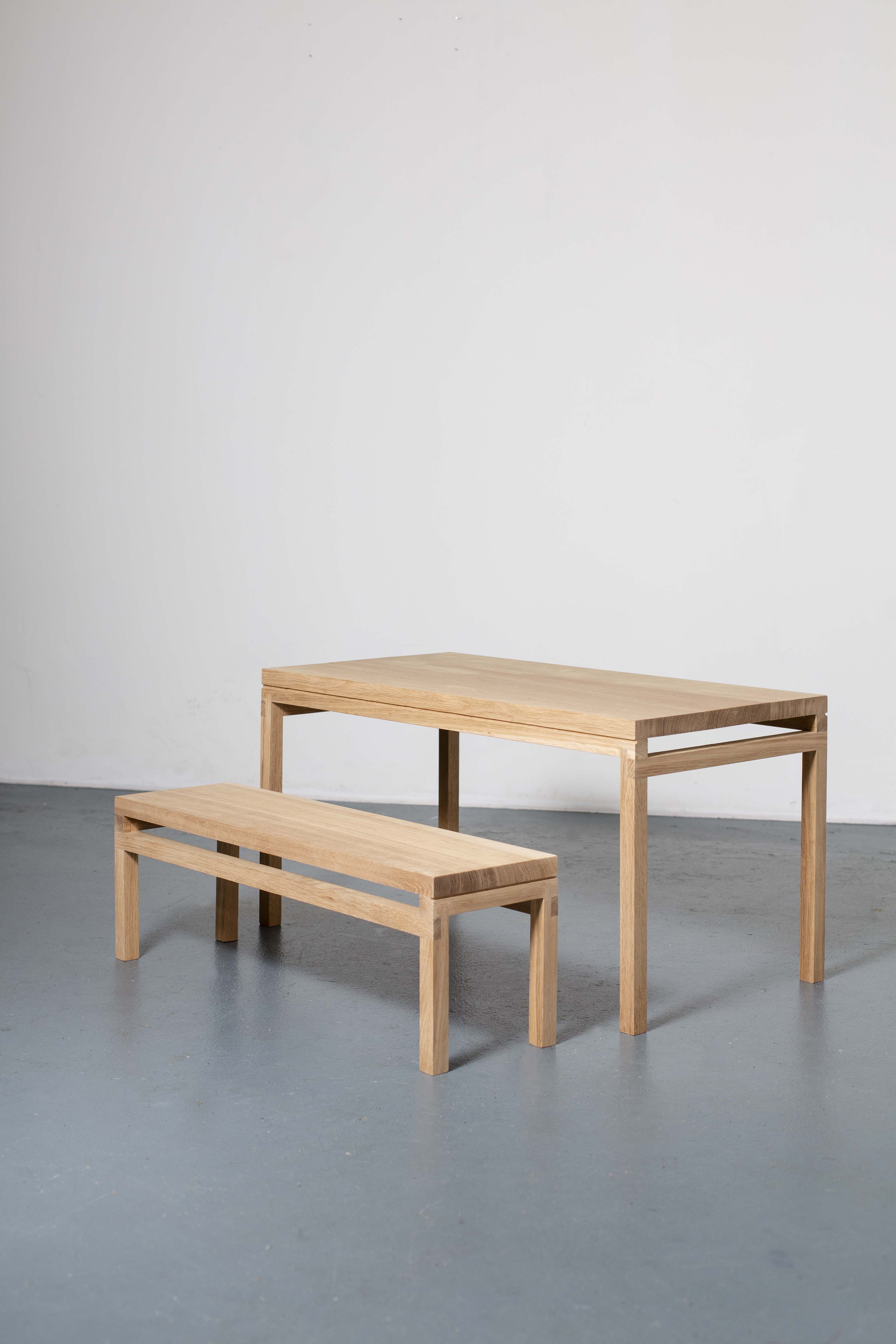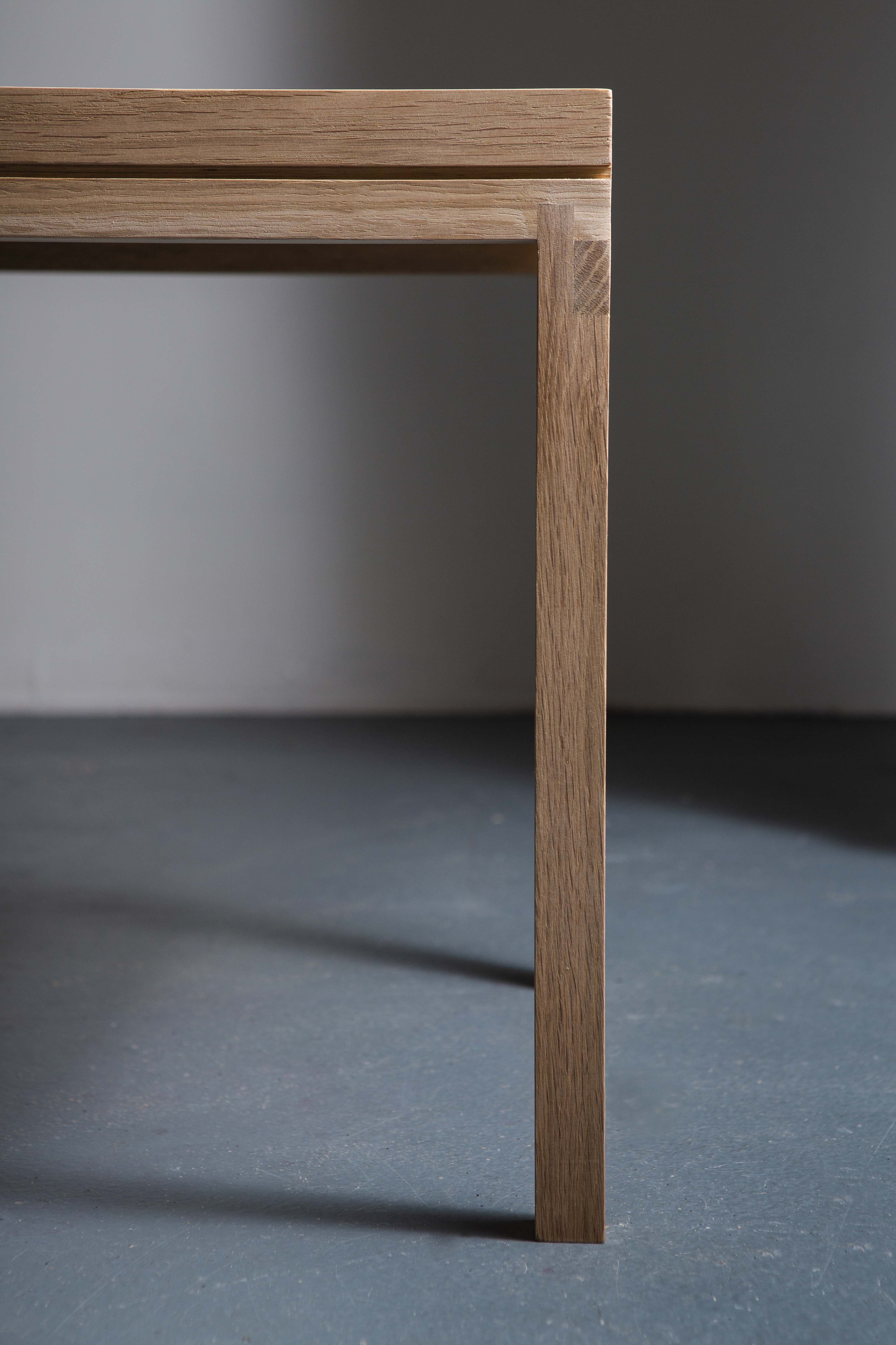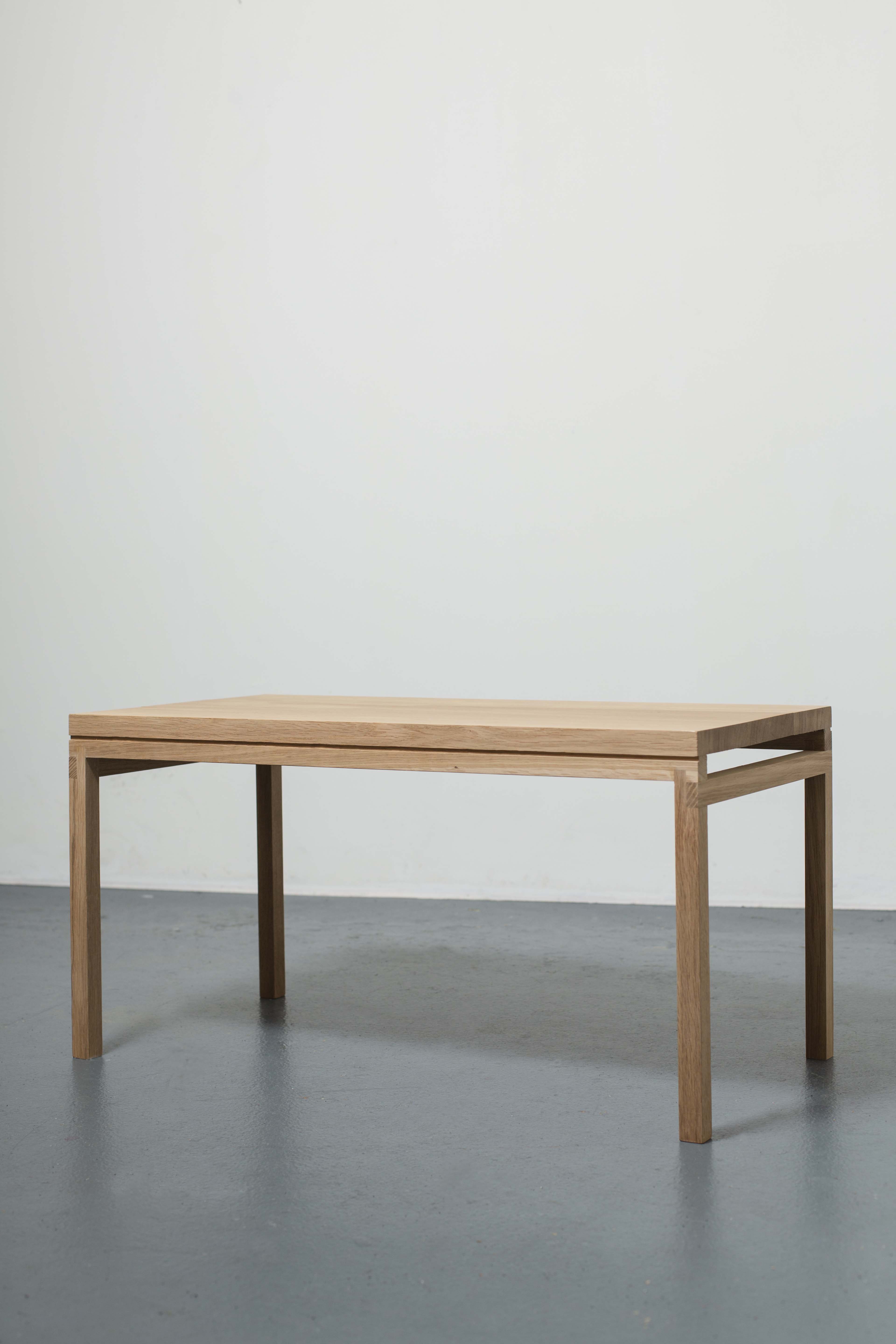 Tischplatte, Zargen und Beine sind in derselben Dicke ausgeführt. Zargen und Beine verbinden sich mit einer traditionellen Überblattung.